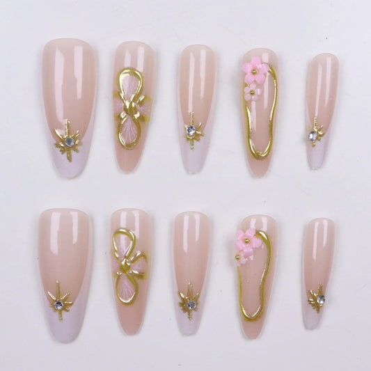 2025 Summer Trendy Handmade Nails Almond Press On Nails 10Pcs 3D Flower Design False Nails with Adhesive Glue & Nail File Set