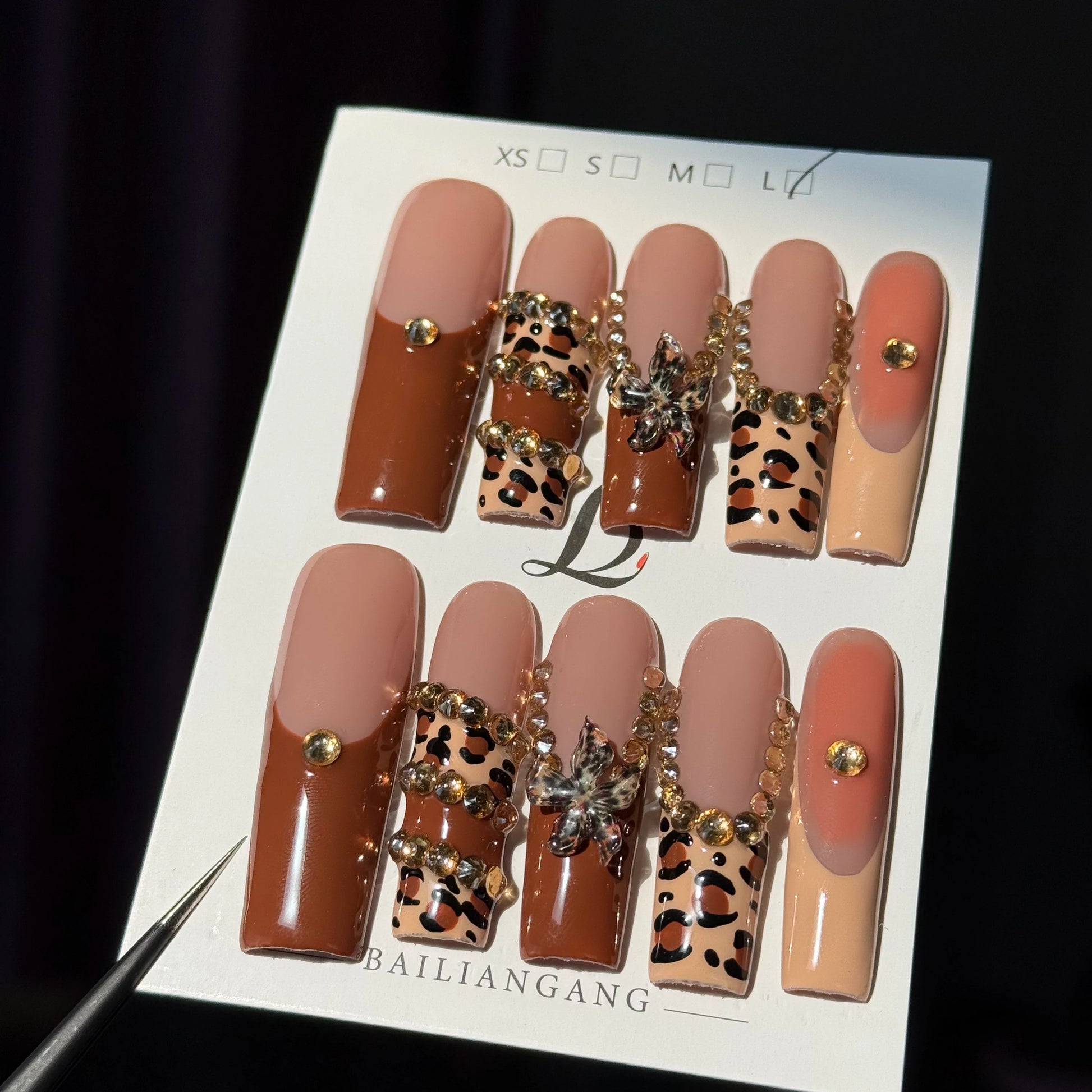 10pcs high-end Maillard color series, hand-painted leopard print, three-dimensional carvings, shiny small diamonds handmade Fren